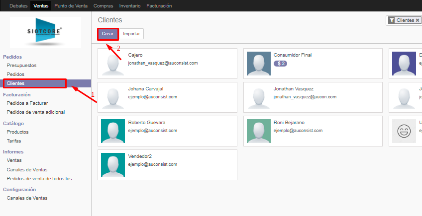 Seguido daremos clic en clientes y a continuación de clic en crear.