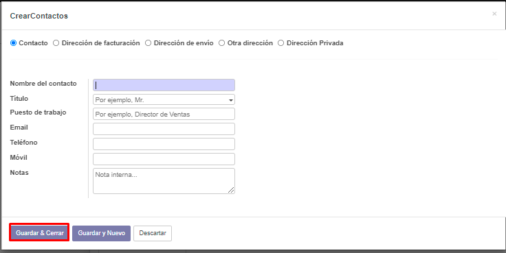 Seguimos con el ingreso de los datos del contacto u otras de las opciones que le aparecen en la parte superior, al finalizar de ingresar la información da click en Guardar y Cerrar.