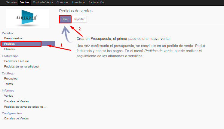 Seguido daremos clic en pedidos y a continuación de clic en crear.