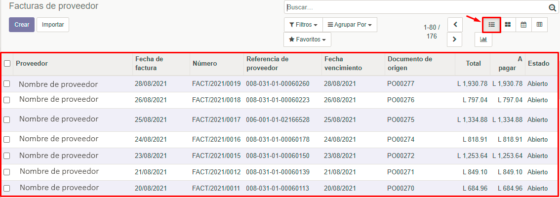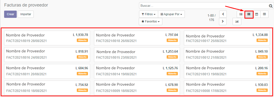 La vista Kanban es una vista basada en tarjeta en la que se muestran los datos de manera organizada para una mejor comprensión. Por ejemplo, puede ver una vista rápida de nombre del proveedor o cliente, valor de factura, número de factura, fecha de factura y estado en el que se encuentra.