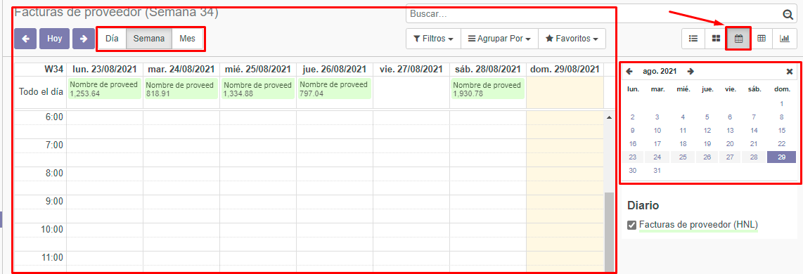 Modo calendario le permitira ver sus facturas por fecha en especifico, semana o mes